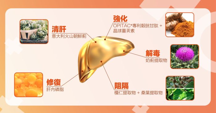 - OPITAC®穀胱⽢肽圓酵⺟ + 晶球薑⿈素:穀胱⽢肽是肝臟解毒的主要因⼦,對抗⾃由基,減低氧化壓⼒。當中晶球技術提升薑⿈素的吸收率,降低飲酒後對肝臟的破壞,改善宿醉並同時去除暗⿈。