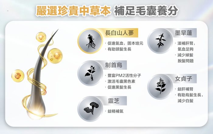 擁有30年活髮智慧的「維新烏絲素」換咗新包裝推出「維新烏絲素(超微粉配方)」,嚴選多種活髮中草本,️新加入珍貴而稀有的長白山人蔘,強效活血行氣,配合制首烏﹑女貞子﹑墨旱蓮﹑靈芝等成分,有效調理肝腎,促進頭髮生長。莊醫師表示結合超微粉技術,有助強化「蔘」層活血功效:「活髮成分可以刺激毛囊生多啲微細血管,當養分運送管道多咗,超微細養分自然就可以更有效地供給毛囊!」