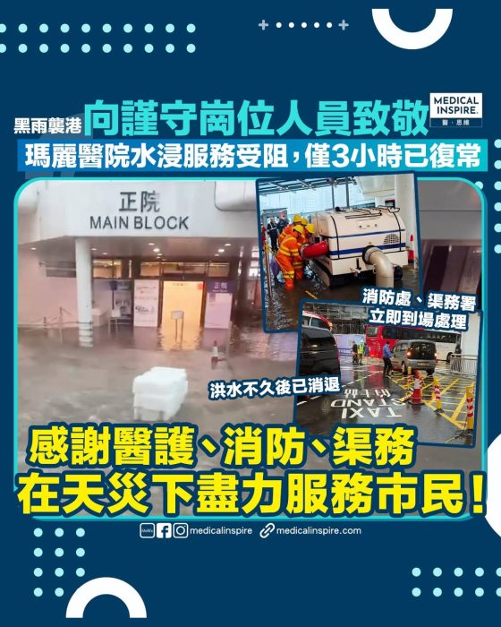 上周二(6日)早上約9時半,醫管局宣佈瑪麗醫院因嚴重水浸,急症室服務受影響,期間需暫時將病人送到約5公里外的律敦治醫院。水浸期間,瑪麗醫院正門外的道路及小巴站頓成澤國,雨水更湧入建築物內,寸步難行。即便如此,醫院上下醫護依然謹守崗位,為冒雨前來求診的病人提供服務。