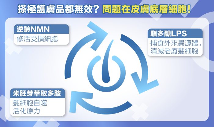 3)逆齡NMN:轉化成NAD+後,激活Sirtuins活性,修復受損毛囊DNA,提升細胞線粒體活力,從根本鞏固髮根防線。