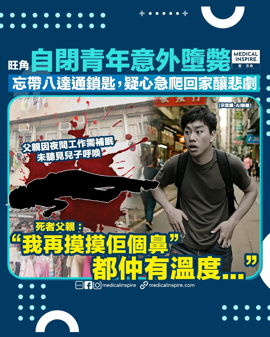 墮樓意外|旺角上周三(20日)發生意外墮斃悲劇。一名患自閉症的22歲楊姓青年,疑因爬回家時失足墮下,經搶救後不治。