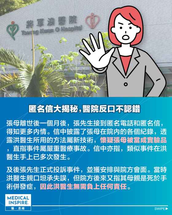 匿名信披露了張母在院內的各個紀錄,透露洪醫生所用的方法屬新技術,懷疑張母被當成實驗品,直指事件屬嚴重醫療事故。信中亦指,類似事件在洪醫生手上已多次發生,「證據指出媽媽發生併發症後,冇得到適當急救,直至返魂無術。」