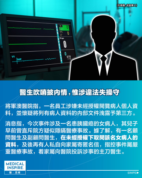 醫療事故|將軍澳醫院近日疑似發生醫療事故,導致一名六旬女病人不幸離世。事隔約半個月,事件再度有新進展。醫院表示,發現有醫生非法洩露機密資料,涉事醫生更已辭職及被捕。