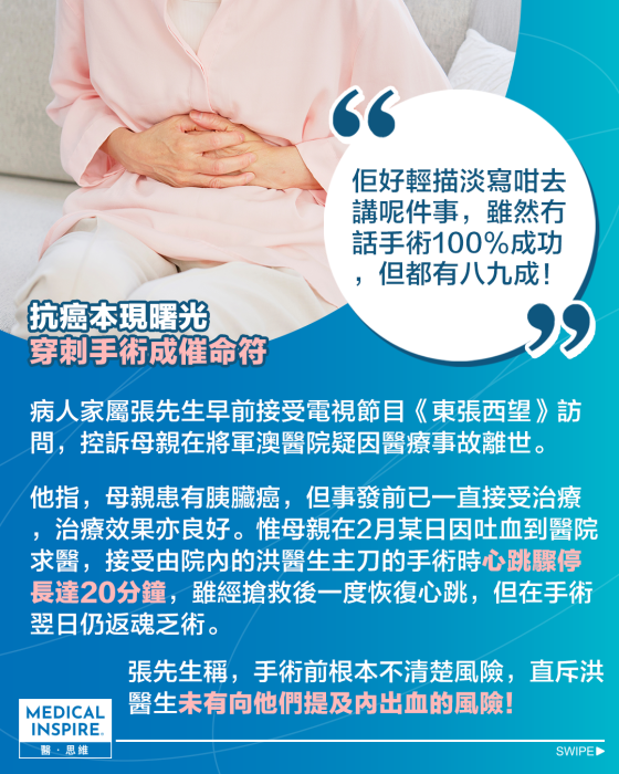 張先生稱,手術前根本不清楚風險,直斥洪醫生未有向他們提及內出血的風險,「佢好輕描淡寫咁去講呢件事,雖然冇話手術100%成功,但都有八九成!」