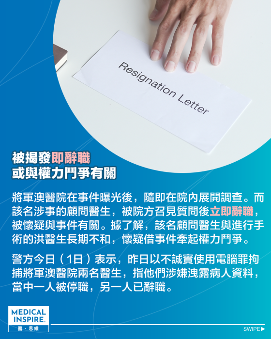 據悉,將軍澳醫院在事件曝光後,隨即在院內展開調查。而該名涉事的顧問醫生,被院方召見質問後,竟立即辭職,被懷疑與事件有關。據了解,該名顧問醫生與進行手術的洪醫生長期不和,懷疑借事件牽起權力鬥爭。