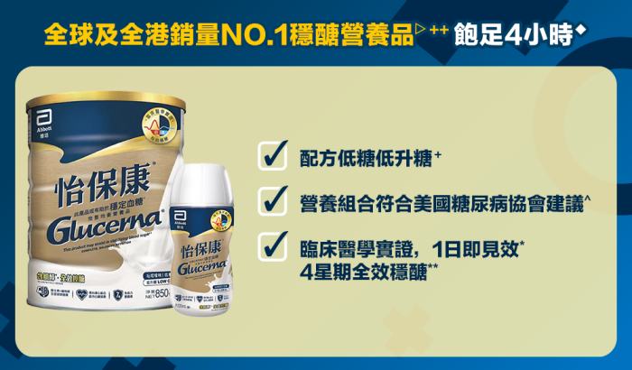 ⁺⁺ 根據NielsenIQ 2014年10月至2023年9月全港營養飲品 (特別在包裝上列明是適合關注血糖的人士 / 此產品或有助穩定血糖 / 此產品適用於關注血糖的人士 / 此產品供關注血糖的人士服用,) 零售調查報告 (©️2023 尼爾森公司版權所有)