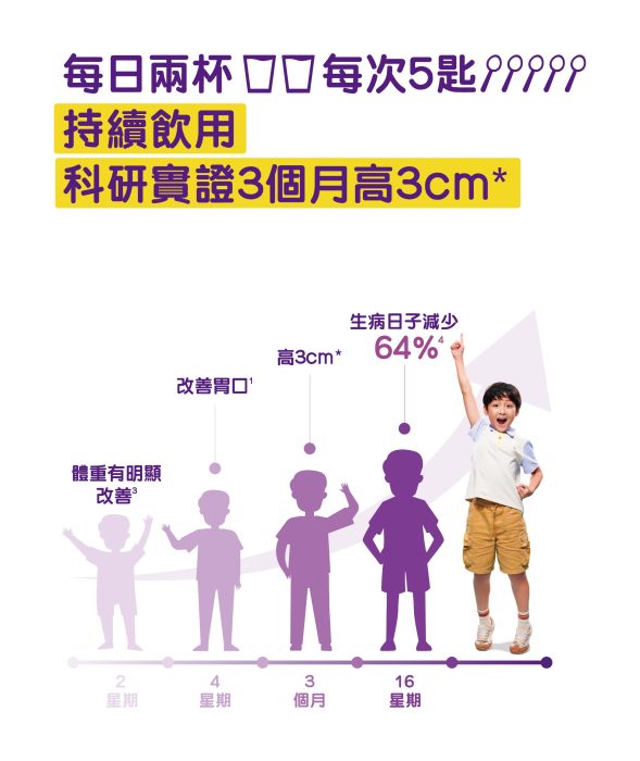 臨床醫學實證,持續飲用雅培保兒加營素,對改善身高體重及增強免疫力都有明顯幫助,科研實証, 8星期明顯改善體重³,並且有效減少64%生病日子⁴。雅培保兒加營素專為兒童而設,不僅是低糖配方(3.87g/ 100ml),也適合乳糖不耐症的小朋友飲用,讓更多孩子能夠輕鬆補充營養。為了讓孩子獲得完整的營養,建議家長每日為孩子沖泡兩杯,每杯使用五匙保兒加營素,可作為早餐飲品或下午茶點心。