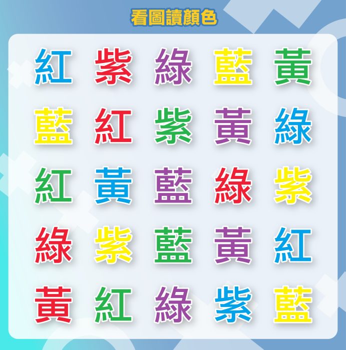 2. 計時開始後,從上至下、根據最左邊的指示,由左至右依次唸出圖片中每個顏色或文字。即第一行讀出顏色,第二行讀出文字,第三行讀顏色,如此類推。