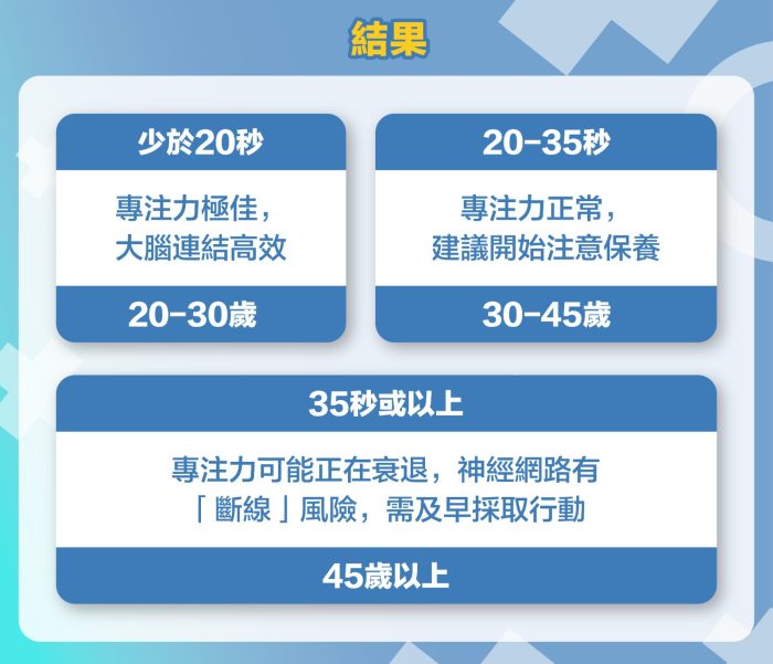 完成測試後,根據你所花的時間,對照以下結果,就能知道你的腦年齡啦!