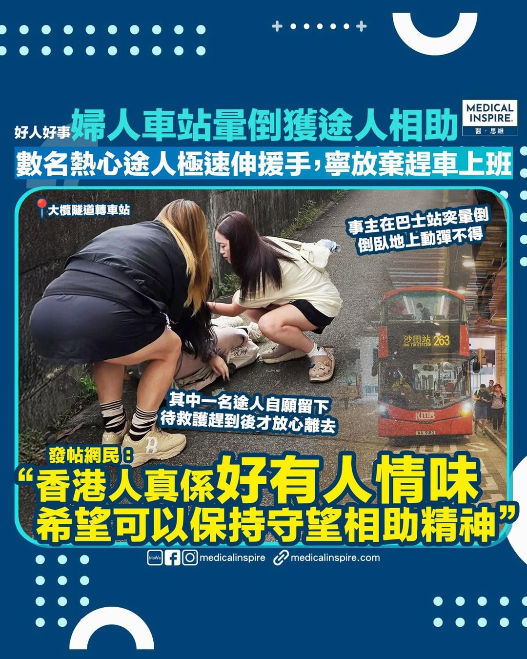 好人好事|香港人經常給予人一種焦急、冷漠的感覺,但每當有事發生,港人互助互讓的熱心總會令人敬佩。日前就有一名女士在外突然暈倒,隨即有多名途人主動伸出援手,更極速「分工合作」,讓事主盡快得到適切照顧。
