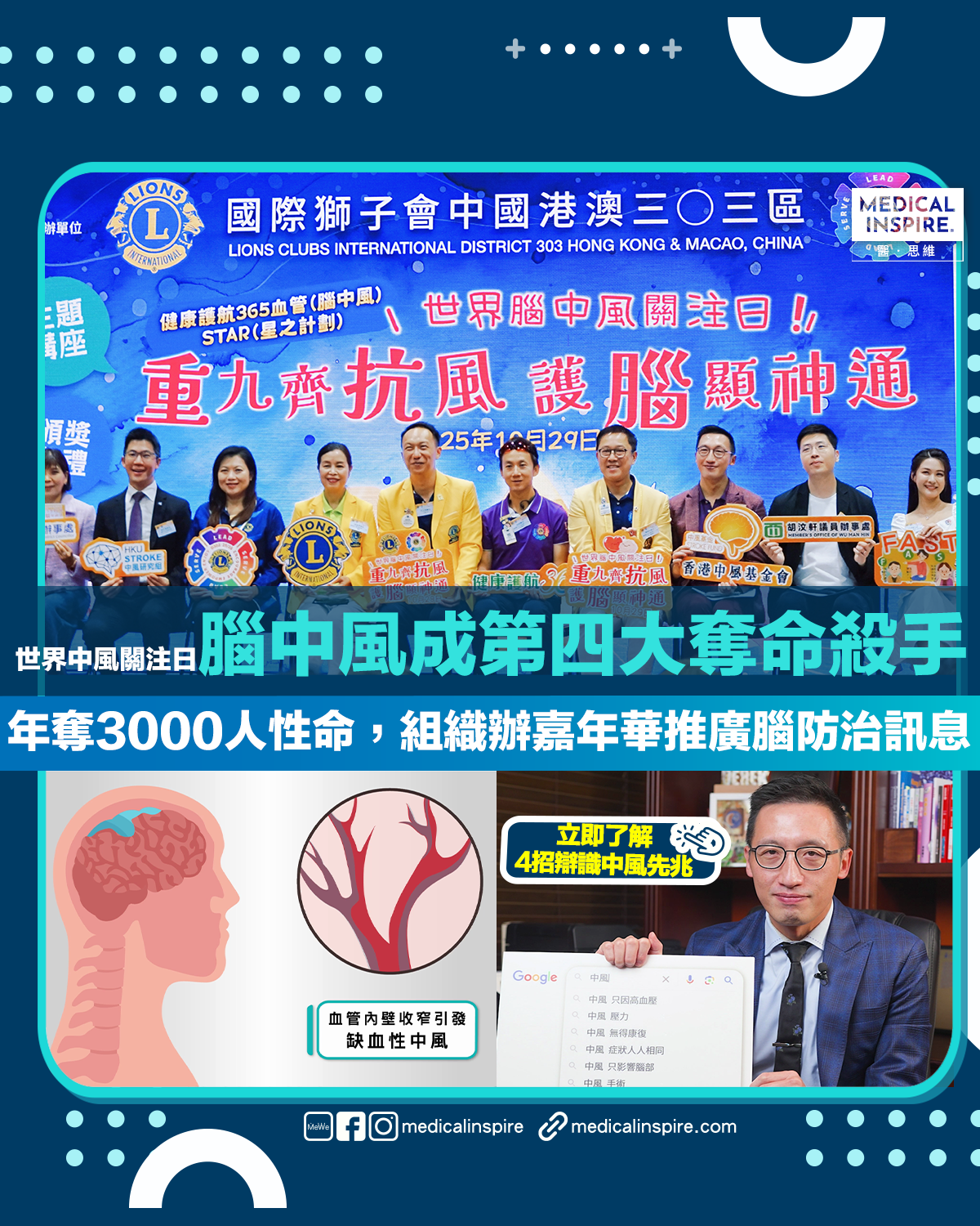 世界中風關注日|中風在香港的致命疾病排行榜中,穩居第四位,每年無情奪去逾3,000人的寶貴性命。中風的恐怖之處,並非僅在於死亡率,更在於其造成的永久性殘疾與龐大的家庭照護負擔。