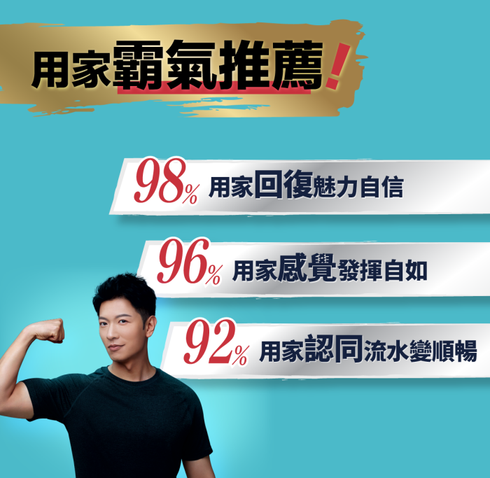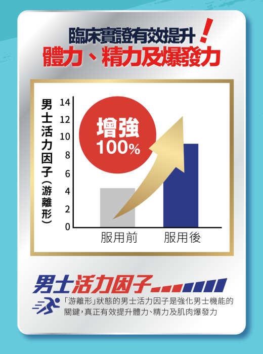 本配方經過嚴格的臨床試驗驗證,結果顯示服用後「男士活力因子」(遊離形)可提升達100%。大多數使用者在3天內即可感受明顯改善,7天後體感更加強勁。調查統計中,98% 的使用者表示重拾魅力自信;96% 的使用者認為表現更加自如;92% 的使用者認同流水順暢問題得到改善。