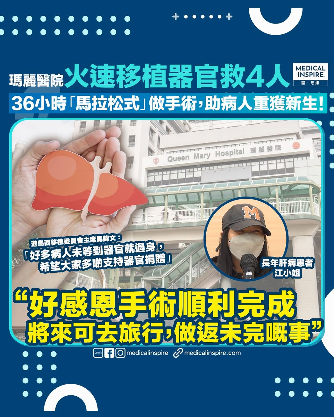 這次「馬拉松式」器官移植,瑪麗醫院總共動員了超過50名醫護及員工,包括外科移植臨床團隊、器官捐贈聯絡主任、手術室團隊等,調動手術室和人手資源,成功進行了2宗肝臟、1宗肺臟及1宗腎臟移植手術。4人康復進度皆良好,現時均已出院。