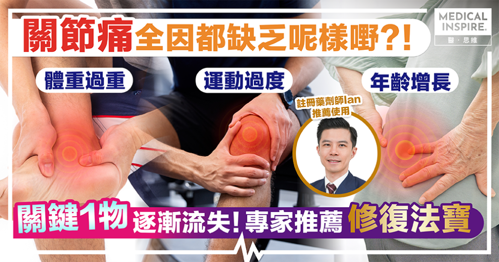 要針對修復首先要了解關節的組成:在關節腔中有一種關節液,負責潤滑和減震的作用,連接軟骨和骨骼,則由網狀的膠原蛋白和鈣構成。當關節健康的時候,這組關節結構自然會順暢運作。但隨著年齡增長、日常生活多久坐不動或運動姿勢不良,都有可能導致關節液減少,令軟骨磨蝕,不單增加關節磨損的機會,亦可能引起關節周圍組織的炎症,導致關節腫脹和疼痛。若持續忽視關節問題,有機會影響日常活動,連走路都變得困難!