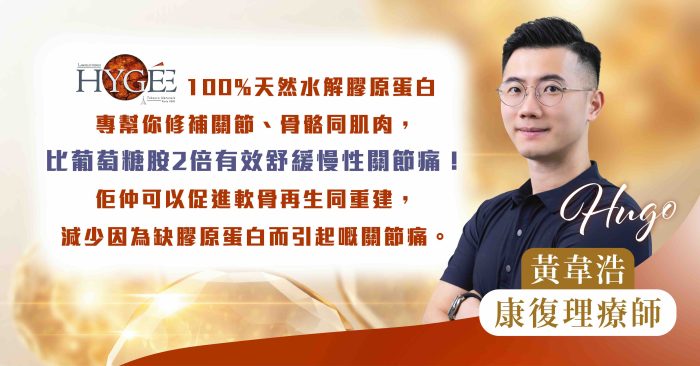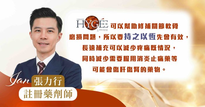 香港註冊藥劑師Ian Cheung指:「HYGEE可以幫助修補關節軟骨磨損問題,所以要持之以恆先會有效,長遠補充可以減少疼痛既情況,同時減少需要服用消炎止痛藥等可能會傷肝傷腎的藥物。」