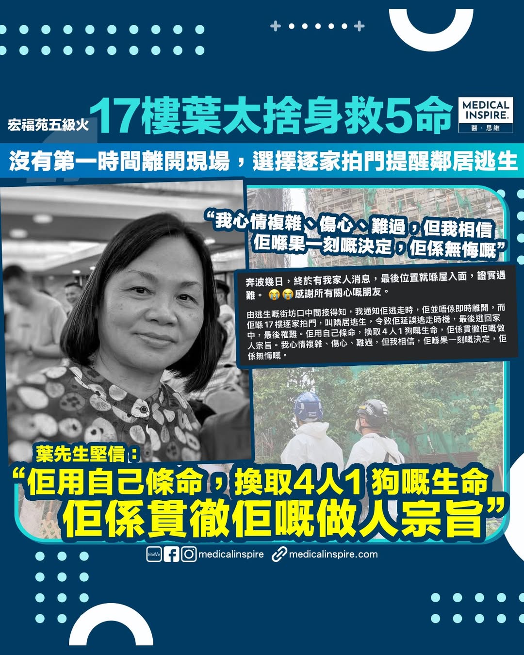 大埔宏福苑五級火|人性極光!17樓葉太捨身救5性命,丈夫淚訴:「佢係無悔嘅,但我好自責!」