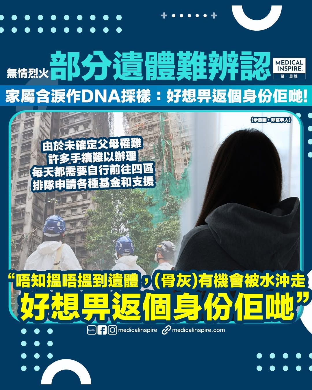 在發生如宏福苑這類造成大量死傷,且遺體嚴重損毀的極端災害後,科學鑑證,特別是DNA比對,是確認身份的「最後防線」和最可靠的方法。