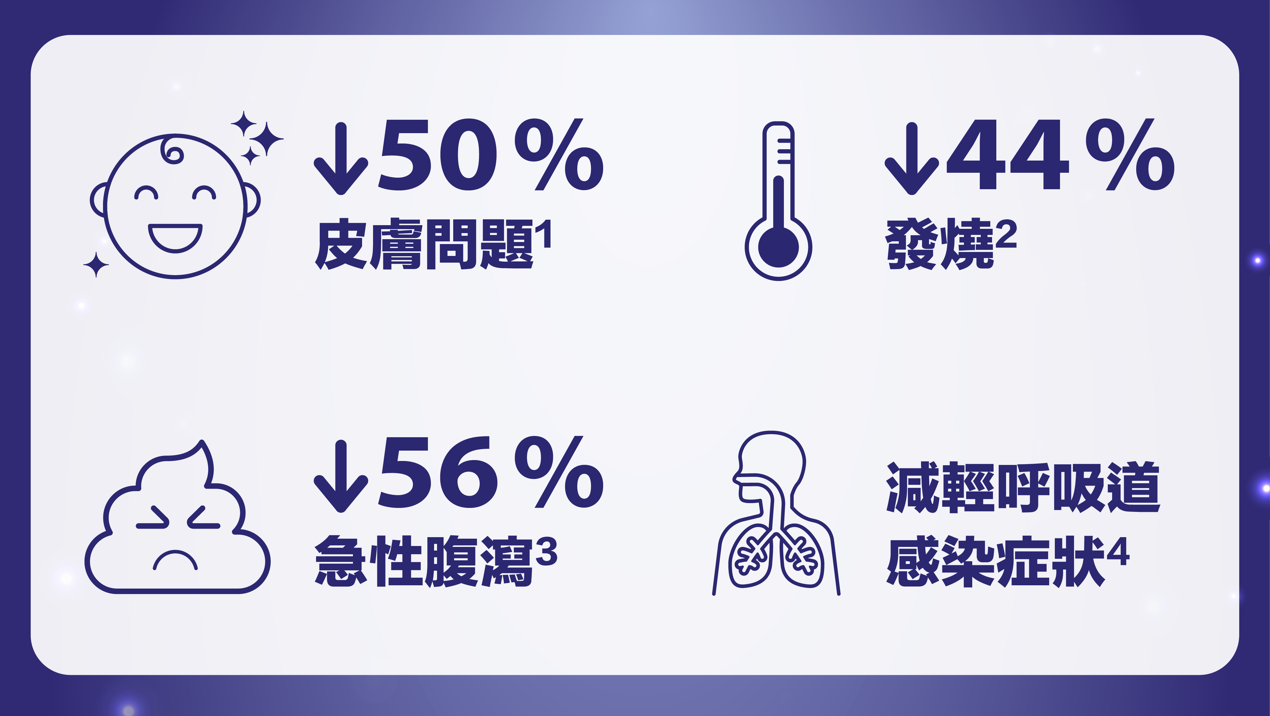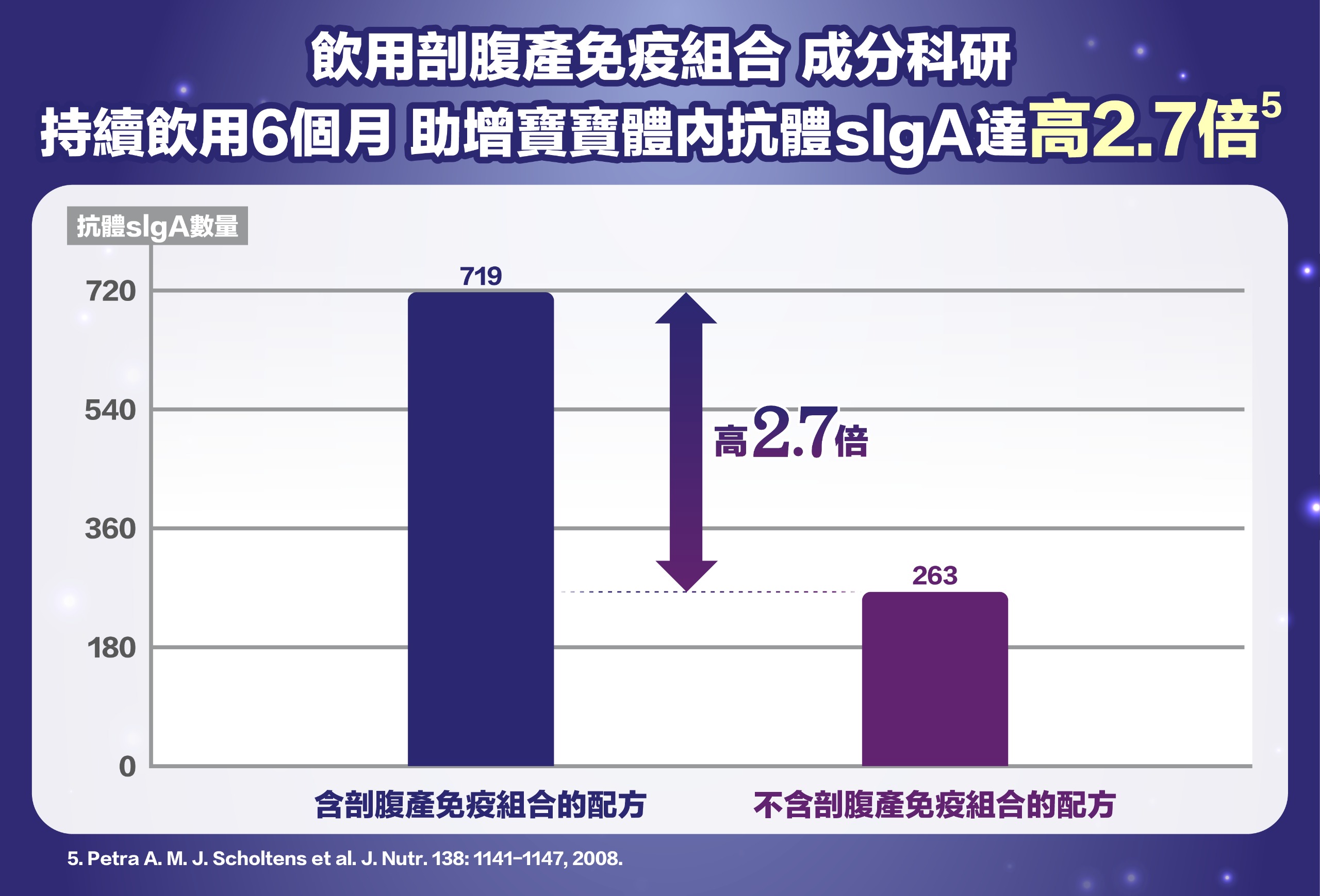 有別於一般奶粉配方,剖腹產寶寶專屬免疫配方精準補充剖腹產寶寶缺乏的「產道免疫益菌」,成分科研指出,持續飲用 6 個月有助於增加寶寶體內抗體 sIgA 達高2.7倍 ⌀,從而加強免疫力。持續飲用 12 個月,抗病力更可以提升近 3 倍 ❖。除此之外,成分科研證實有效減少常見免疫問題,包括減少 50% 的皮膚問題¹ 、減少 44% 的發燒² 、減少 56% 的急性腹瀉³及有助於減輕呼吸道感染的症狀⁴。