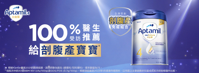 ▽根據Kantar香港在2020年9月進行的一項市場調查結果。受訪對象為Aptamil白金版用家中的剖腹產媽媽。樣本數目為95。