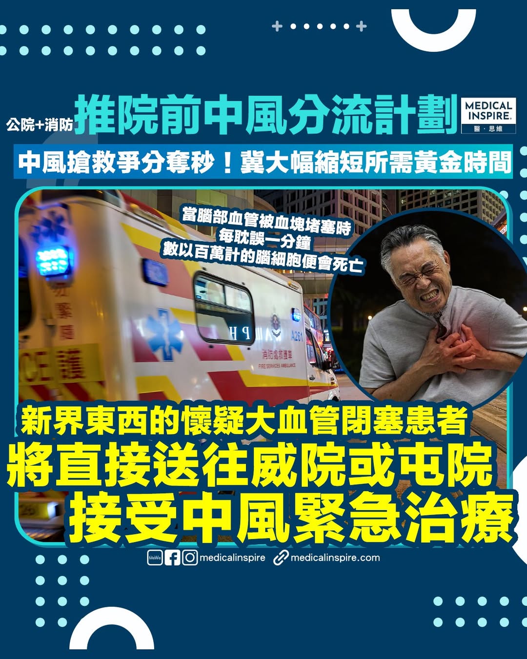 中風是香港市民健康的頭號大敵,尤其當腦部血管被血塊堵塞(大血管閉塞)時,每耽誤一分鐘,數以百萬計的腦細胞便會死亡,後果不堪設想。為了爭取搶救的「黃金時間」,醫院管理局(下稱醫管局)與消防處聯手宣布,將於今日(15日)起,在新界東及新界西醫院聯網推行一項革命性的措施——「院前中風分流計劃」。