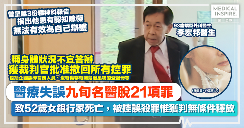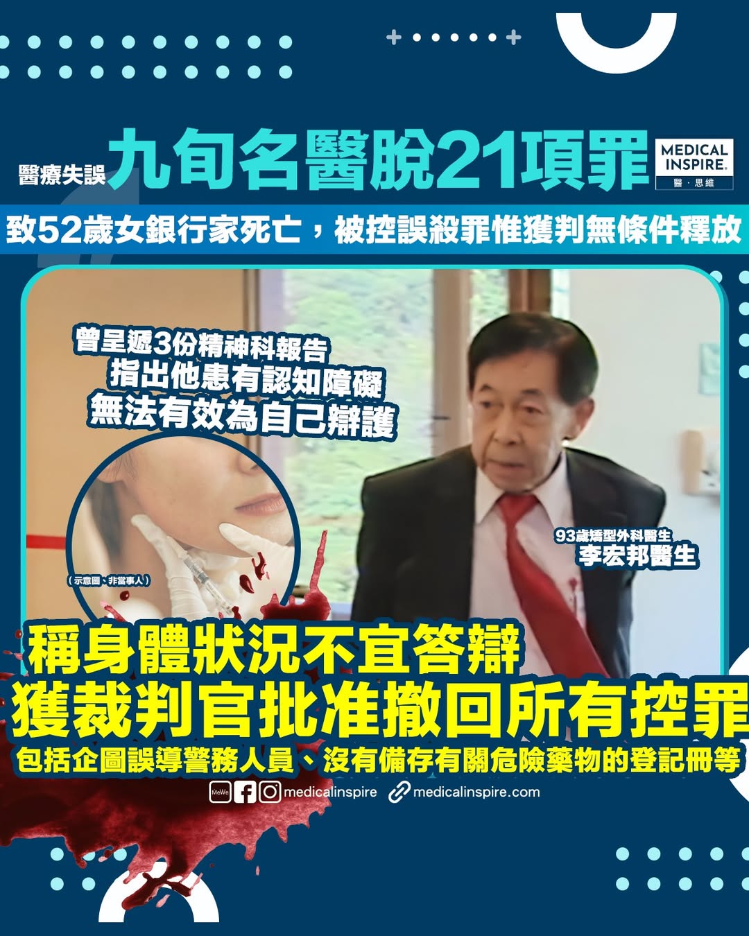 醫療失誤最終裁決|致52歲女銀行家死亡,被控誤殺罪惟獲判無條件釋放。九旬名醫李宏邦因病「不宜答辯」獲撤 21 罪。