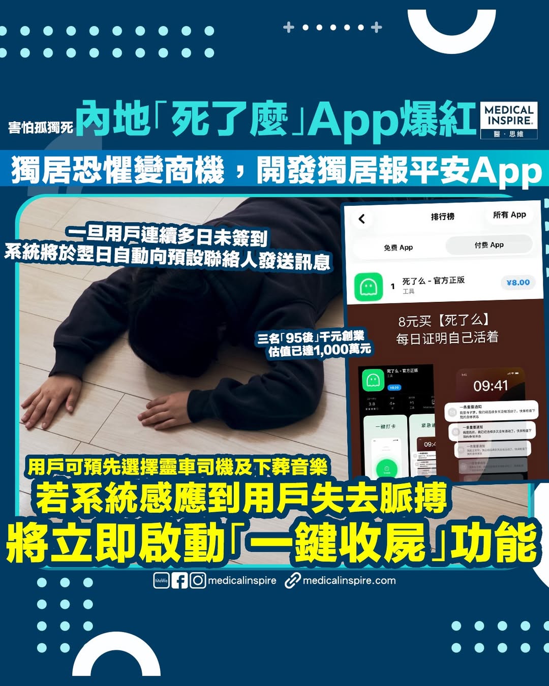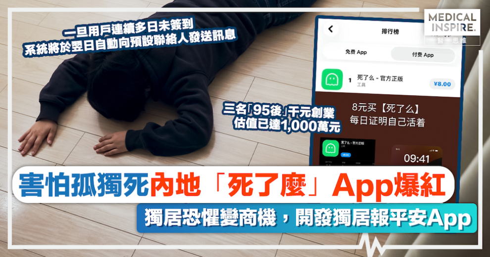 孤獨死|如果一個人獨居打拼或隻身留學,萬一在室內發生意外卻無人知曉,就容易變成「孤獨死」。近日,內地一款名為「死了麼」的手機應用程式在網絡爆紅,更衝上蘋果App Store付費榜榜首。