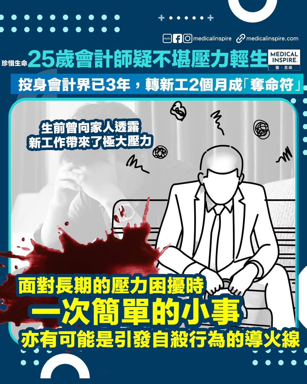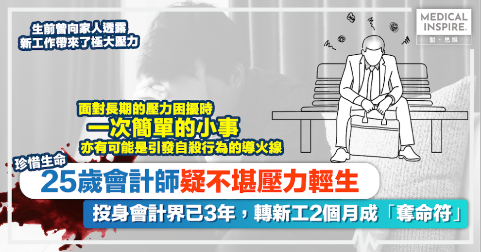 據了解,事主投身會計界已有3年時間,正處於事業的衝刺期。大約兩個月前,他轉職到一間新公司工作,原以為是事業的新里程,豈料卻成了情緒崩潰的導火線。事主在生前曾向家人透露,新工作帶來了極大的壓力。面對全新的工作環境、繁重的核數任務以及對自我要求的準則,沉重的「無形擔子」最終可能超出了他的負荷上限。在缺乏適當的情緒疏導下,這位年輕才俊選擇了最極端的方式尋求「解脫」。