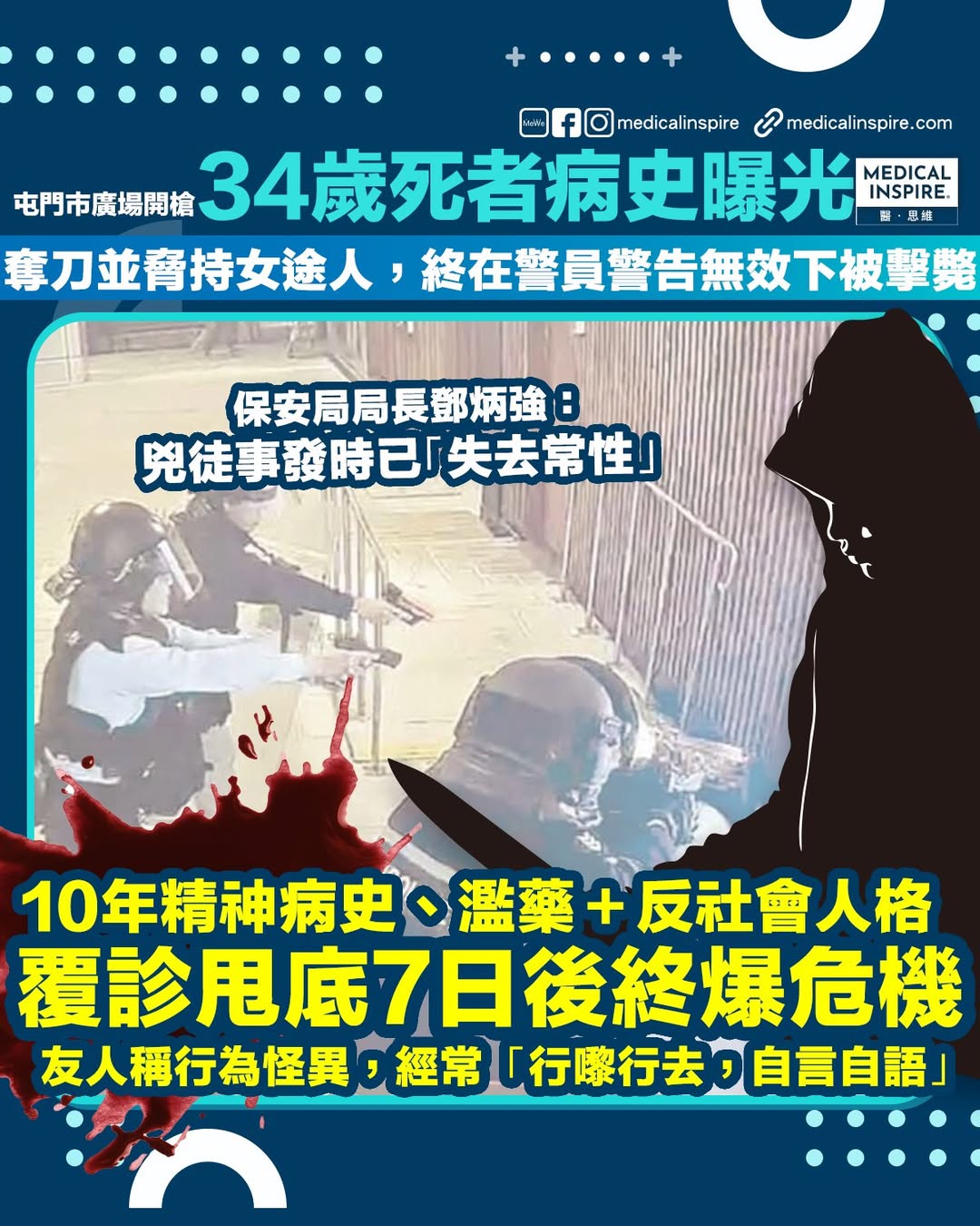 屯門市廣場開槍|昨晚(15日)屯門市廣場的兩聲槍響,瞬間再次打破香港人逐步回復的日常寧靜,同時再次喚起大眾對社區精神健康支援的關注。一名綽號「恐龍」的34歲越南裔男子,在DON DON DONKI廚房奪刀並脅持女途人,最終在警員警告無效下被連開兩槍擊斃。