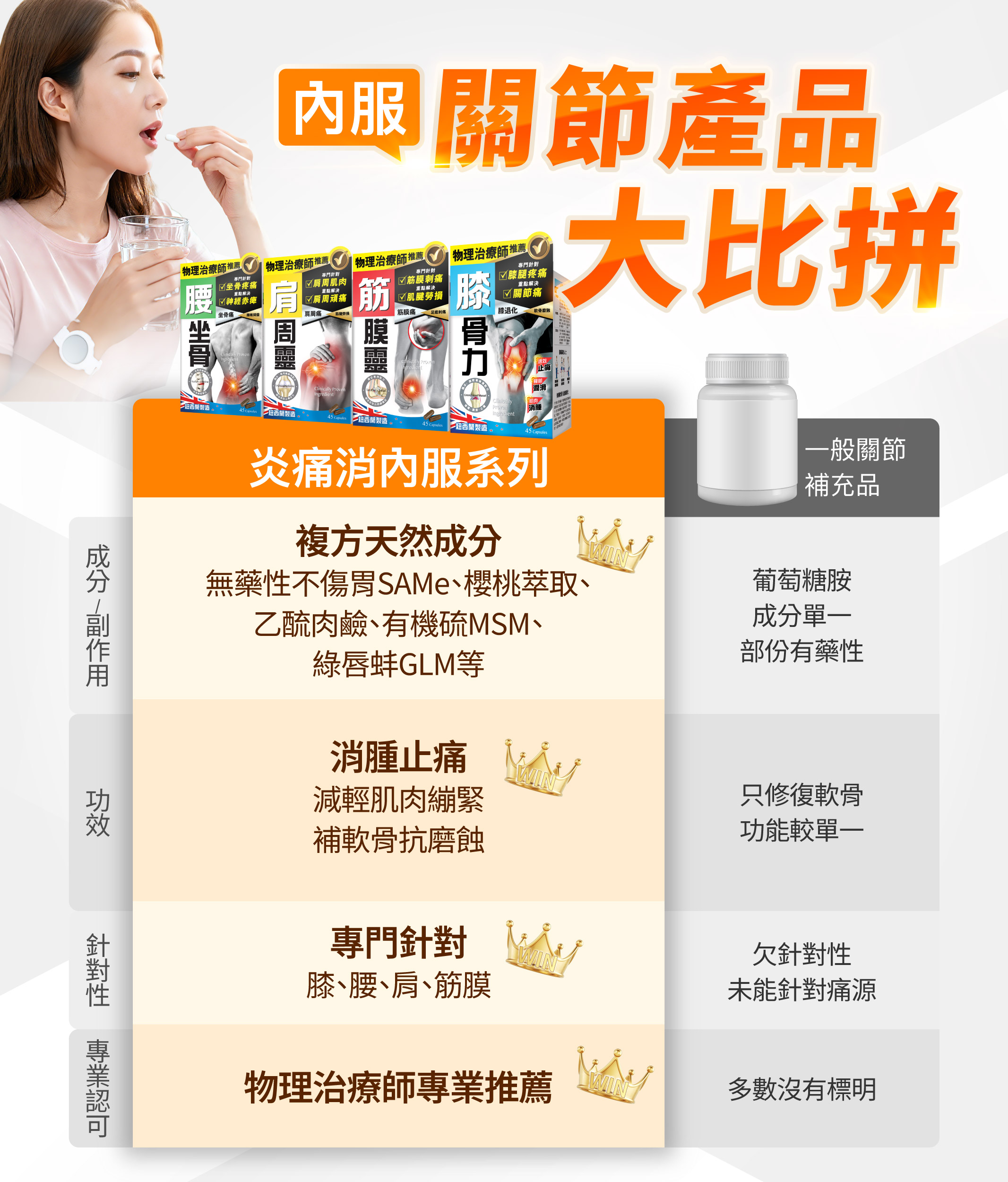 物理治療師黃琳玲推薦有需要人士選用「炎痛消」,相比成分單一的補充品,「炎痛消內服系列」使用複方天然成分,當中包括:SAMe、櫻桃萃取、乙醯肉鹼、有機硫 MSM 及綠唇蚌 GLM等,有效消紅止痛、減輕肌肉繃緊並補軟骨抗磨蝕。系列具備高度針對性,對應腰、膝、 肩、足底筋膜等不同部位擊退痛症,且紐西蘭製造,不傷胃,讓大家服用時更放心 。