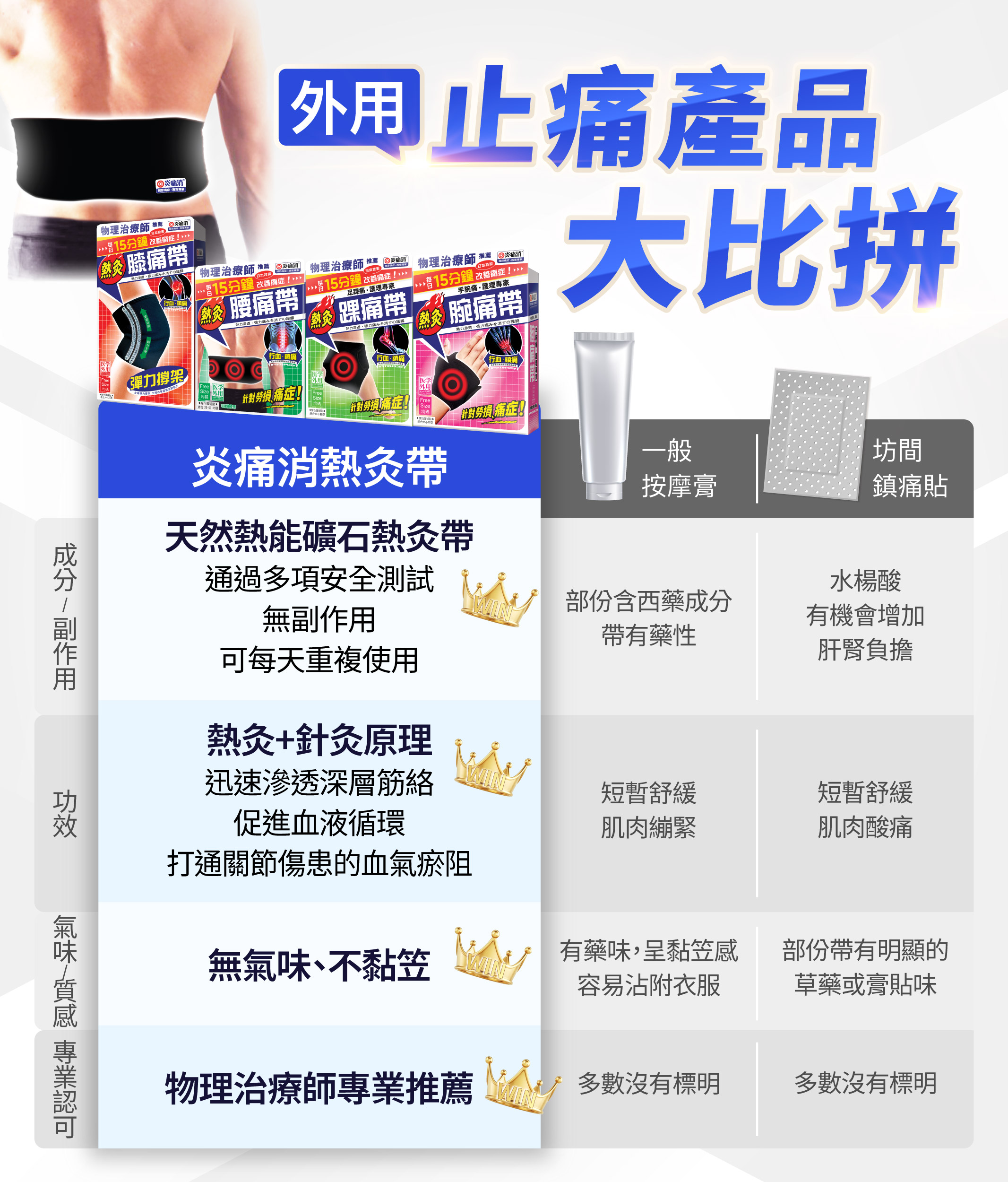 「炎痛消熱灸帶」則打破傳統,以熱灸結合針灸原理,只需15分鐘*即可產生天然熱力,迅速 滲透深層筋絡,打通氣血瘀阻,有效消腫止痛。產品通過安全測試,無副作用,更可重複使用 150次,亦有物理治療師推薦,安全可靠 。