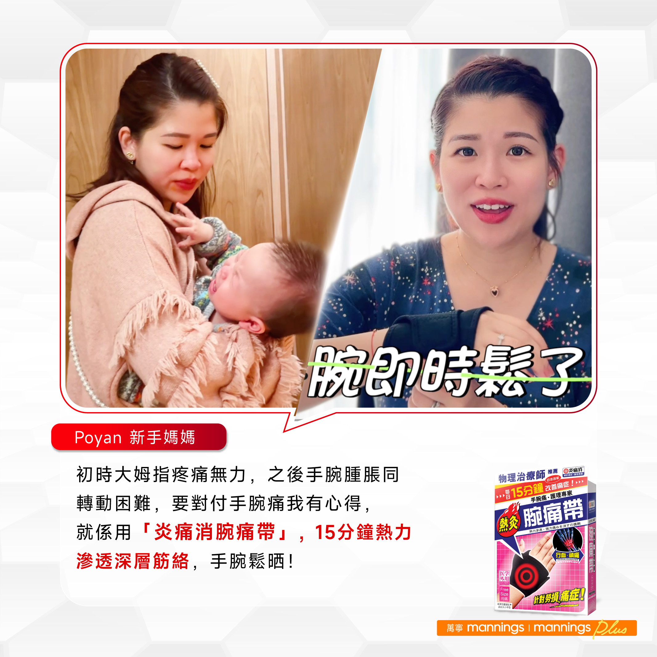 新手媽媽 Poyan 則分享了對抗手腕痛的心得,她曾因大拇指疼痛無力、手腕腫脹而轉動困難, 全靠「腕痛帶」的熱力滲透深層筋絡,讓手腕迅速恢復輕鬆 。