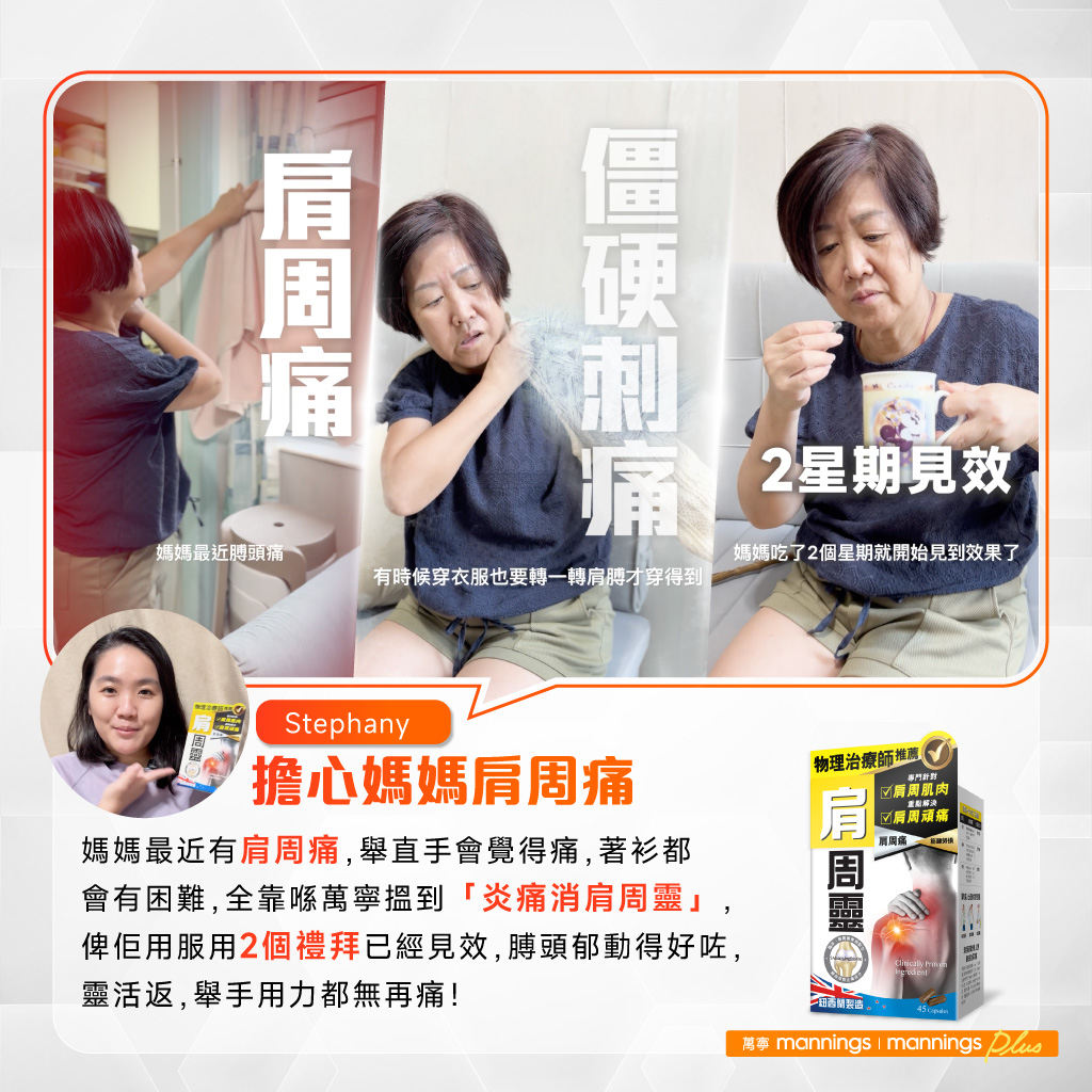 此外,Stephany 的媽媽也曾飽受肩周痛之苦,連穿衣和舉手都感到困難,但在服用「肩周靈」 兩星期後,膊頭活動能力明顯改善,變得靈活且發力不再疼痛,重拾健康生活 。