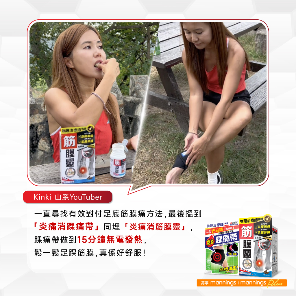 山系 YouTuber Kinki在尋找對付足底筋膜痛的方法時,也發現「炎痛消踝痛帶」搭配「筋膜 靈」效果卓越,特別是踝痛帶能做到15分鐘*無電發熱,有效改善足踝筋膜痛 。