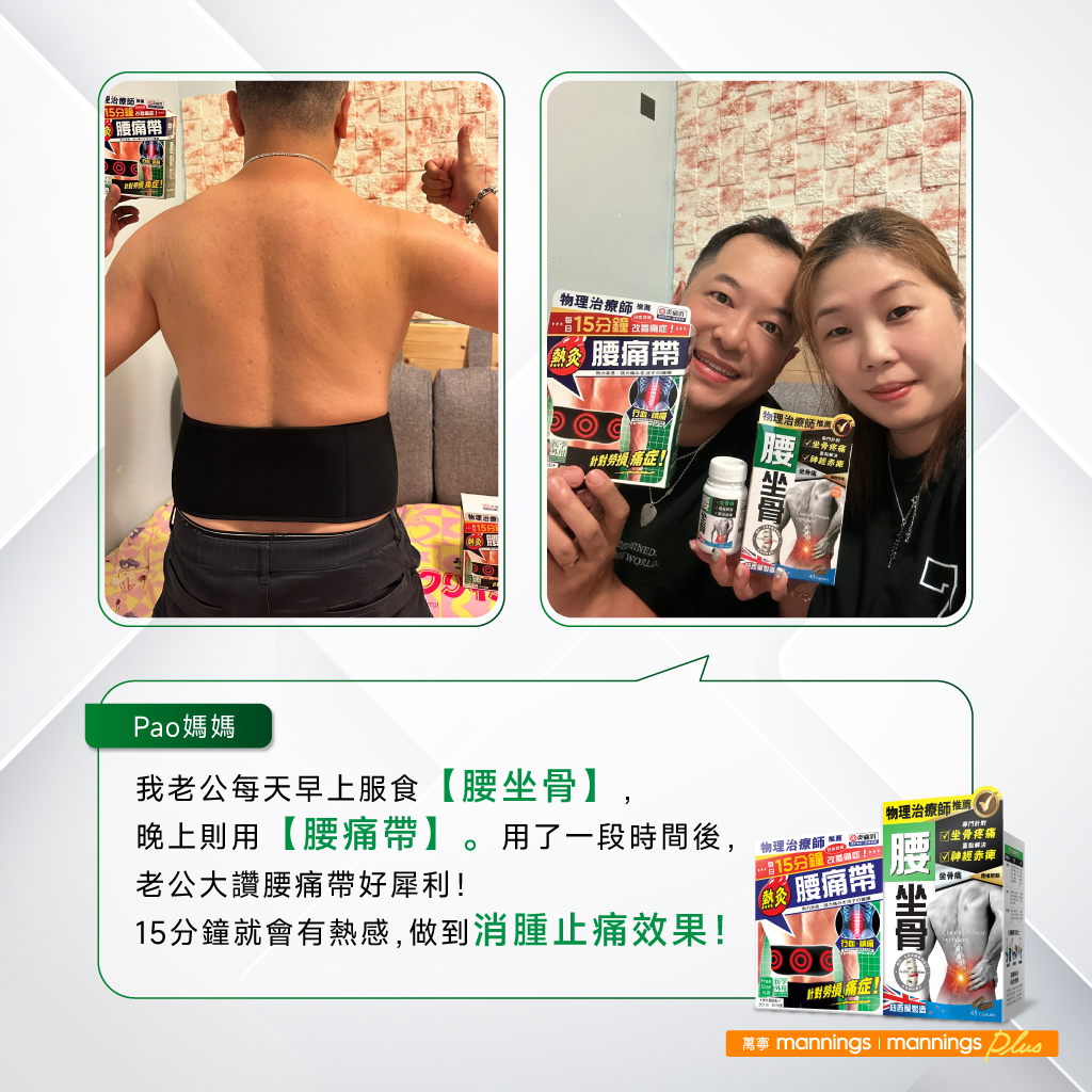 對於日常勞損及關節退化問題,「炎痛消」同樣幫到手。Pao 媽媽提到,她老公每天早上服用 「腰坐骨」晚上則使用「腰痛帶」,使用一段時間後大讚腰痛帶消腫止痛的效果極其出色,15 分鐘*即能產生熱感。