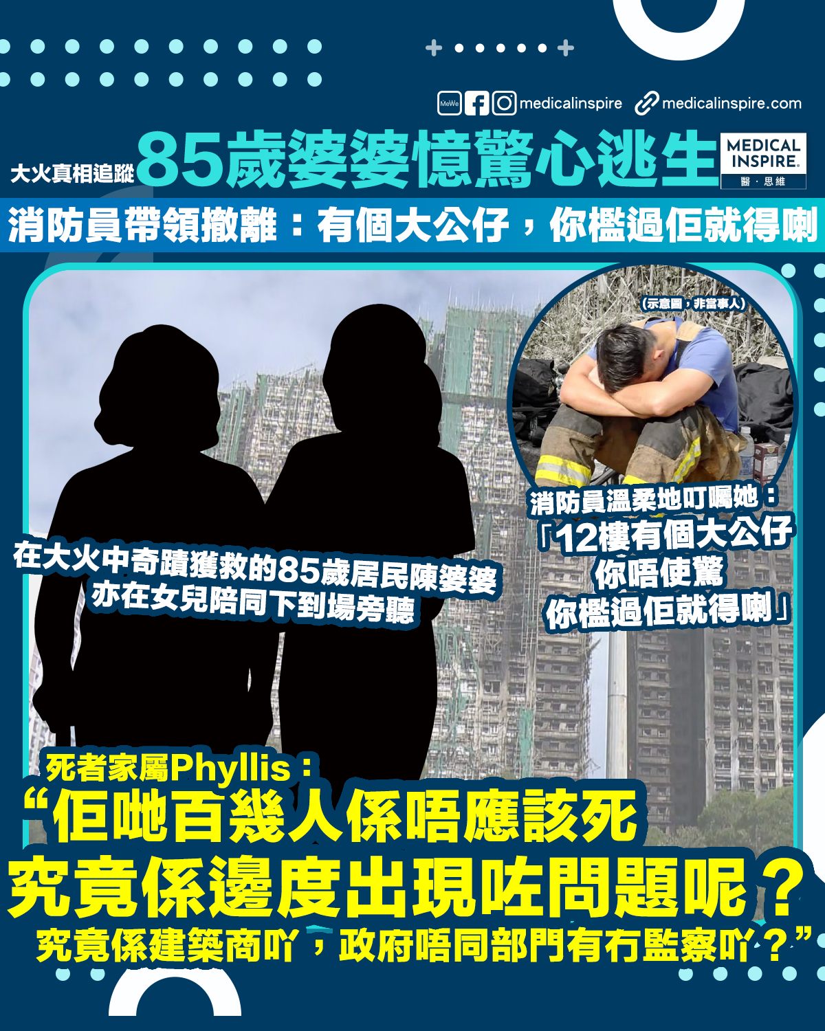 「佢哋百幾人係唔應該死,究竟係邊度出現咗問題呢?究竟係建築商吖,政府唔同部門有冇監察吖?」。