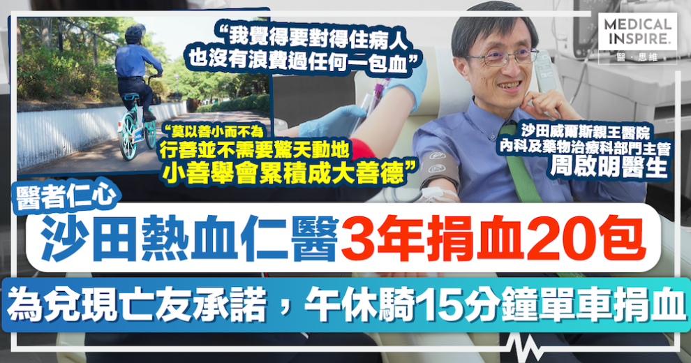 醫者仁心|在救人前線,醫生往往與時間競賽,但在脫下白袍後的午休時間,有一位醫者選擇用另一種方式延續生命。沙田威爾斯親王醫院內科及藥物治療科部門主管周啟明醫生,過去三年堅持在公餘時間騎單車前往捐血站,至今已累計捐出二十多包血液。這份堅持背後,原來藏著一段與亡友的感人承諾。