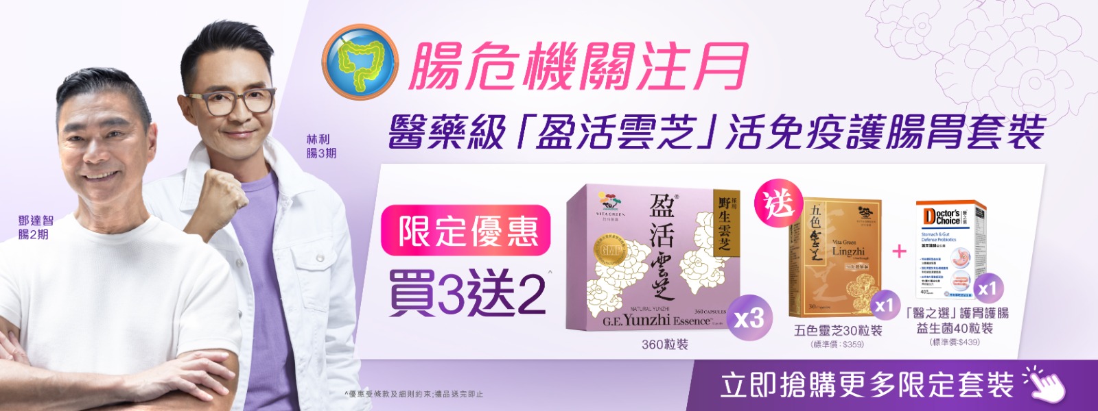 現在購買醫藥級「盈活雲芝」360粒裝不僅能享有激減$700的限時優惠*,即每盒$2,999 (標準價:$3,699),更額外贈送醫之選「護胃護腸益生菌」,其標靶型益生菌可抑制壞菌生長達 82%⁺ 。買 3 盒更會加送皇牌五色靈芝30粒裝(標準價:$359)及醫之選「護胃護腸益生菌」40粒裝(標準價:$439)!立即把握限時優惠: