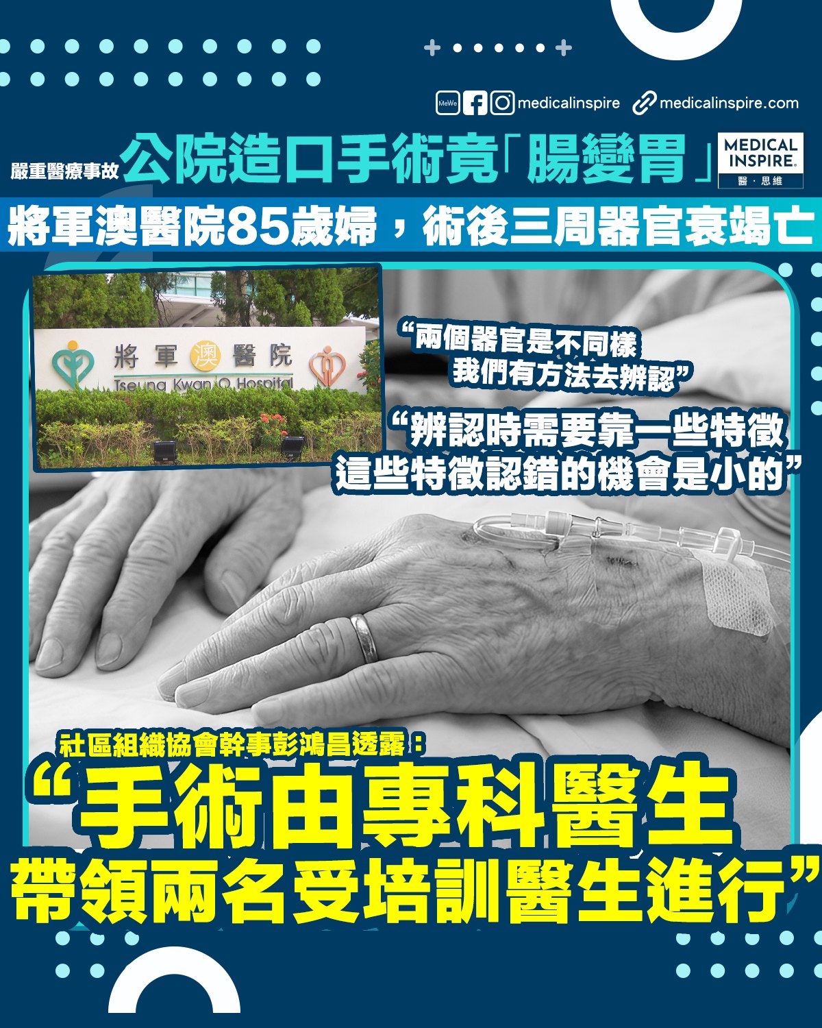 公院嚴重醫療事故|將軍澳醫院近日發生一宗令人震驚的嚴重醫療事故,一名患有結腸癌的85歲老婦,原本接受橫結腸造口手術以緩解腸阻塞,豈料手術竟然「腸胃不分」,將造口錯置於胃部。病人在術後三周情況持續轉差,最終在發現出錯的同日不治。