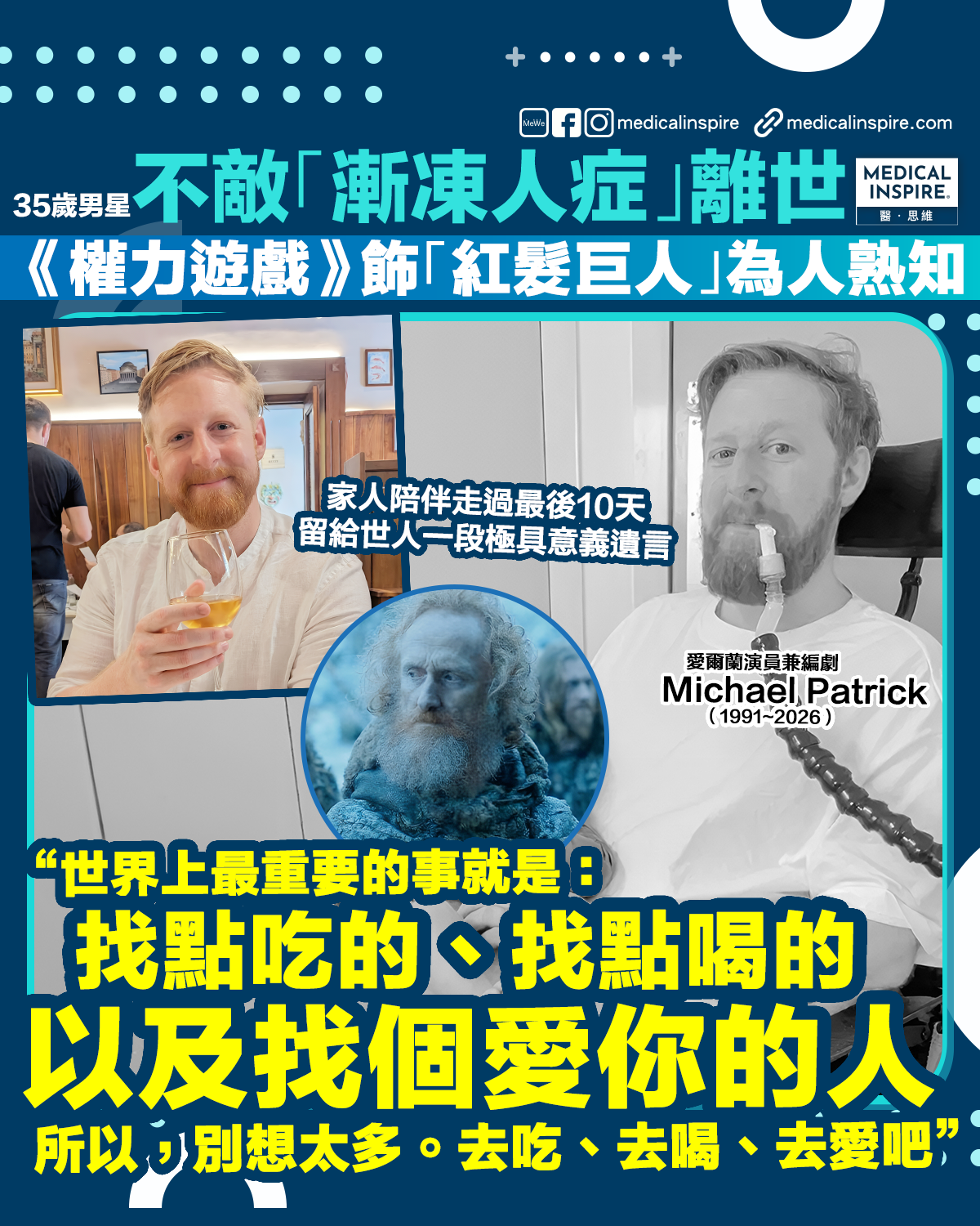 名人病逝|曾參演全球熱門影集《冰與火之歌:權力遊戲》(Game of Thrones)的愛爾蘭演員兼編劇Michael Patrick,近日傳出令人惋惜的消息。這位在螢幕上充滿生命力的男星,在與俗稱「漸凍人症」的運動神經元疾病(Motor Neurone Disease, MND)搏鬥三年後,最終於當地時間 4 月 7 日晚間在北愛爾蘭安寧病房離世,終年僅 35 歲。