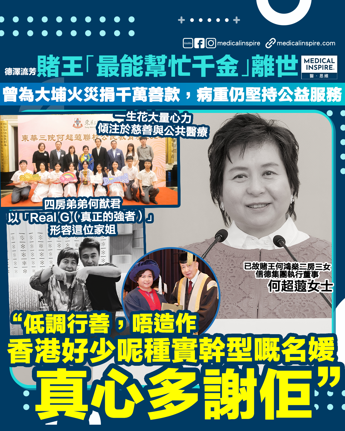 德澤流芳|賭王「最能幫忙千金」何超蕸離世。曾為大埔火災捐千萬善款,病重仍堅持公益服務:全港市民會記得妳的好。