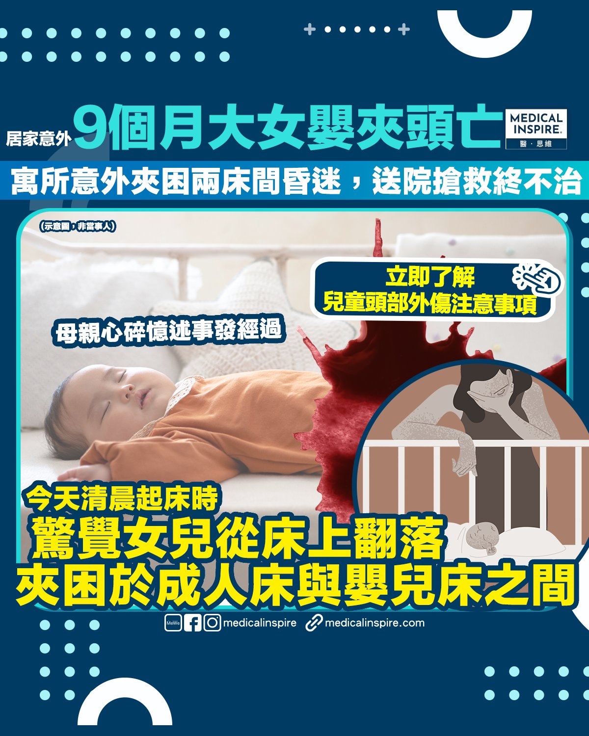致命家居意外|痛心!炮台山9個月大女嬰,寓所意外夾困兩床間,終昏迷不治。母親心碎憶述事發經過。日前(27日)香港發生一宗令人痛心的幼兒居家意外,一名年僅九個月大的女嬰,在北角炮台山寓所內被發現夾在成人床與嬰兒床之間,陷入昏迷。女嬰被緊急送往律敦治醫院搶救,可惜最終證實不治,警方東區重案組已接手調查此宗悲劇。