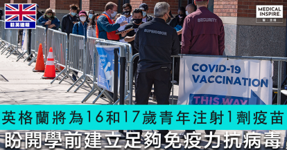 【開學準備】英格蘭將於8月23日前為16和17歲青年注射1劑疫苗 盼開學前建立足夠免疫力抗病毒