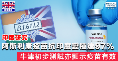 【英國疫苗】印度研究指阿斯利康疫苗有效抵抗印度變種達97% 牛津初步測試疫苗對印度變種B.1.617.2有效