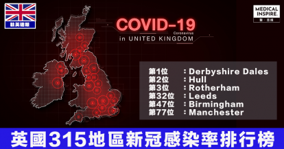 【英國疫情】英格蘭315個地區新冠病毒感染率排行榜 Derbyshire Dales排榜首