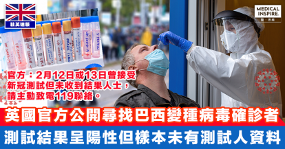【人心惶惶】英國官方公開尋找一名巴西變種病毒確診者 測試結果呈陽性但樣本未有個人資料