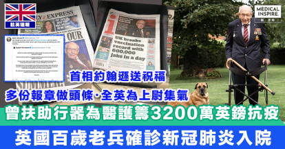 【全城集氣】曾扶助行器繞花園百圈為醫護籌3200萬英鎊抗疫,百歲上尉確診新冠肺炎入院首相送慰問。