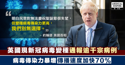 【新冠肺炎】英國發現新冠病毒變種,或致病毒傳播速度加快70%。
