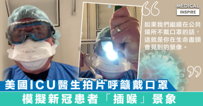 【疫情持續】美國 ICU 醫生拍片,模擬新冠患者「插喉」的景象,籲人民要戴口罩。