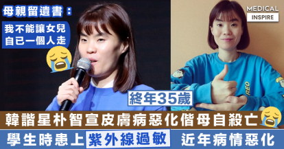 【RIP】韓諧星朴智宣皮膚病惡化偕母自殺亡,求學時患上「紫外線過敏」 近年病情惡化。