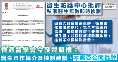 【香港疫情】衛生防護中心批私家醫生無為病人做病毒檢測。醫學會:醫生己作檢測建議、不應受公開批評。